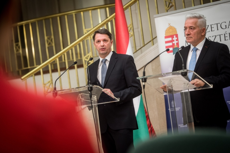 Cseresnyés Péter, a Nemzetgazdasági Minisztérium munkaerőpiacért és képzésért felelős államtitkára és Palkovics Imre, a Munkástanácsok Országos Szövetségének elnöke (Fotó: Botár Gergely/kormany.hu)