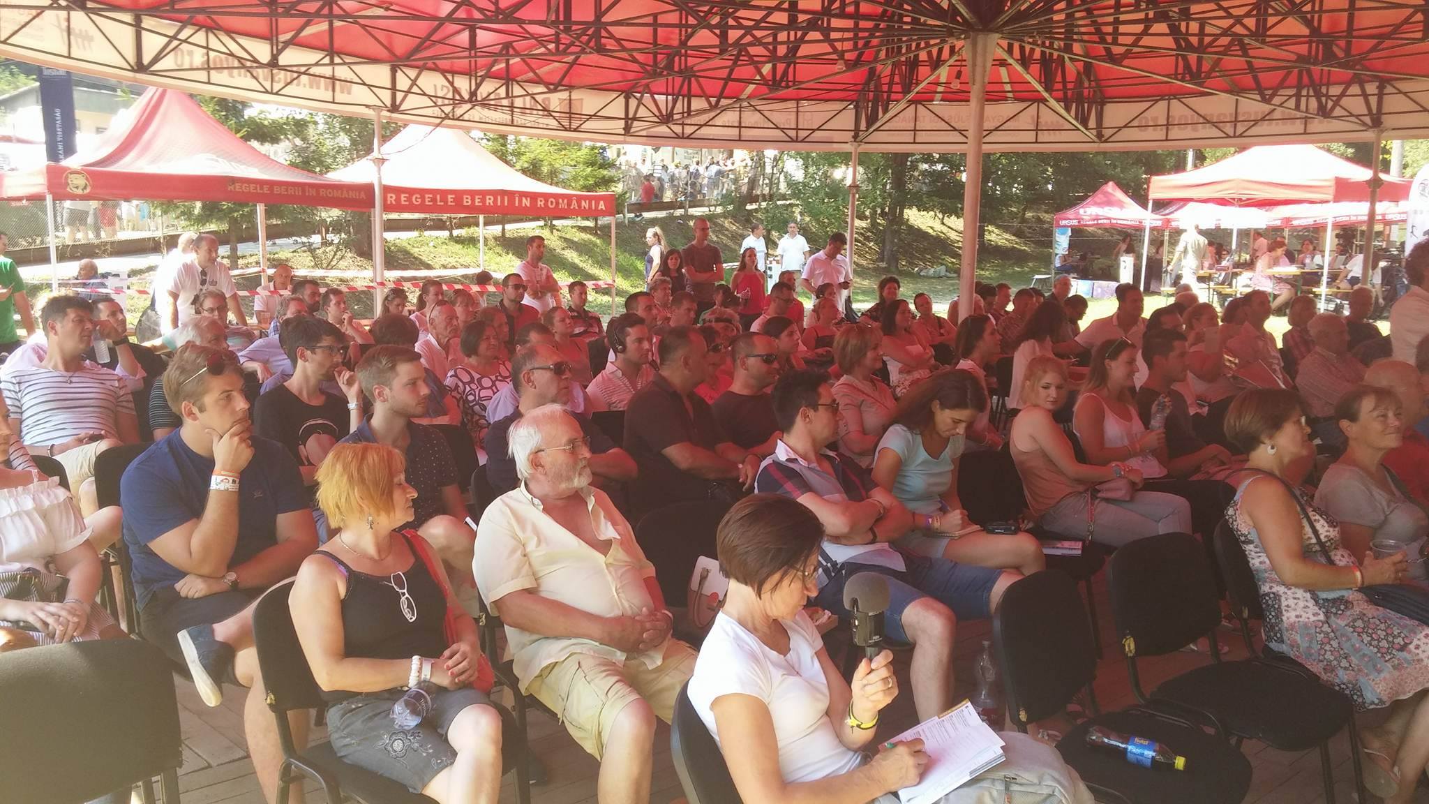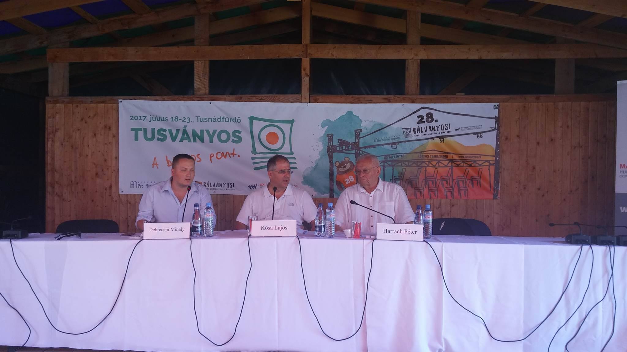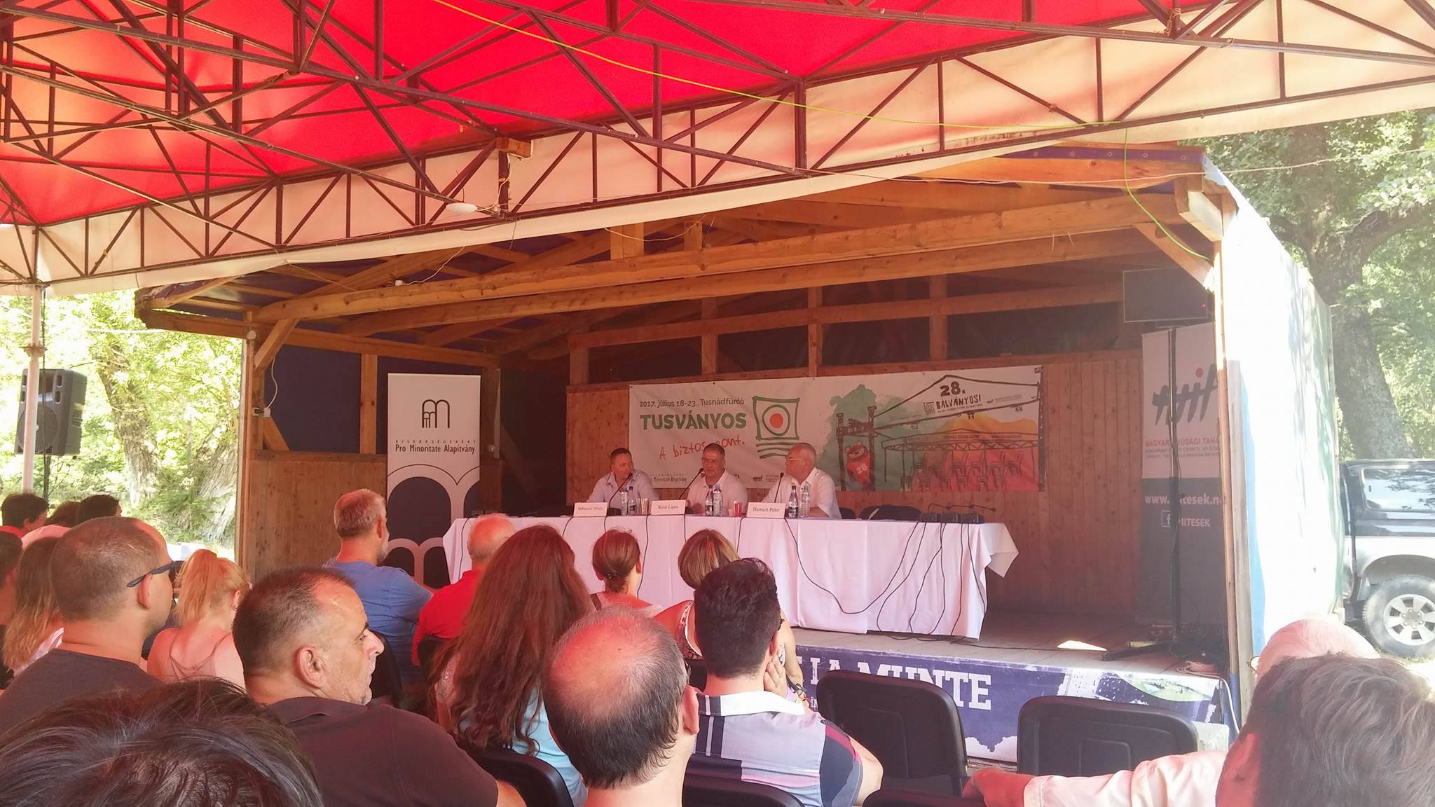 Kósa Lajos, a Fidesz parlamenti frakcióvezetője (b) előadást tart, mellette Harrach Péter, a Kereszténydemokrata Néppárt parlamenti frakcióvezetője a 28. Bálványosi Nyári Szabadegyetem és Diáktáborban (Tusványos) az erdélyi Tusnádfürdőn 2017. július 21-én. (MTI Fotó: Veres Nándor)