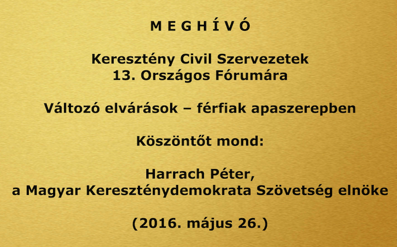 Magyar Kereszténydemokrata Szövetség és a Barankovics Alapítvány szeretettel meghív minden érdeklődőt a Keresztény Civil Szervezetek 13. Országos Fórumára május 26-án, a Parlament Felsőházi termébe. A rendezvény címe: „Változó elvárások – férfiak apaszerepben", amely téma köré hat szakértői előadást szerveztek. A résztvevőket Harrach Péter, a Magyar Kereszténydemokrata Szövetség elnöke köszönti.