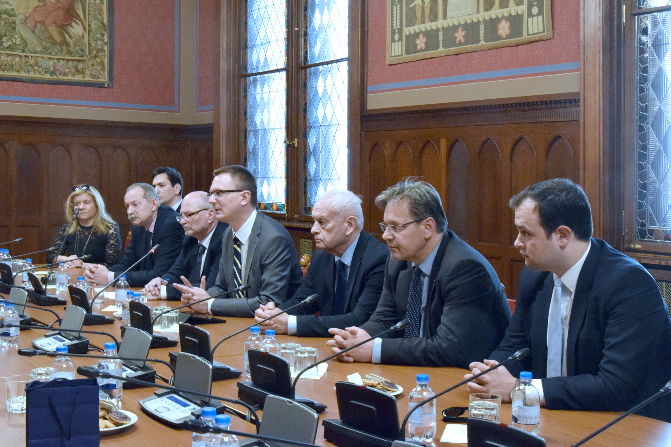 Bashar Matti Warda erbíli érsek (b2), Lui Rafael Szakó babiloni káld katolikus pátriárka (k) és Hölvényi György kereszténydemokrata európai parlamenti képviselő (j) a megbeszélésen (KDNP Fotó: Váli Miklós)