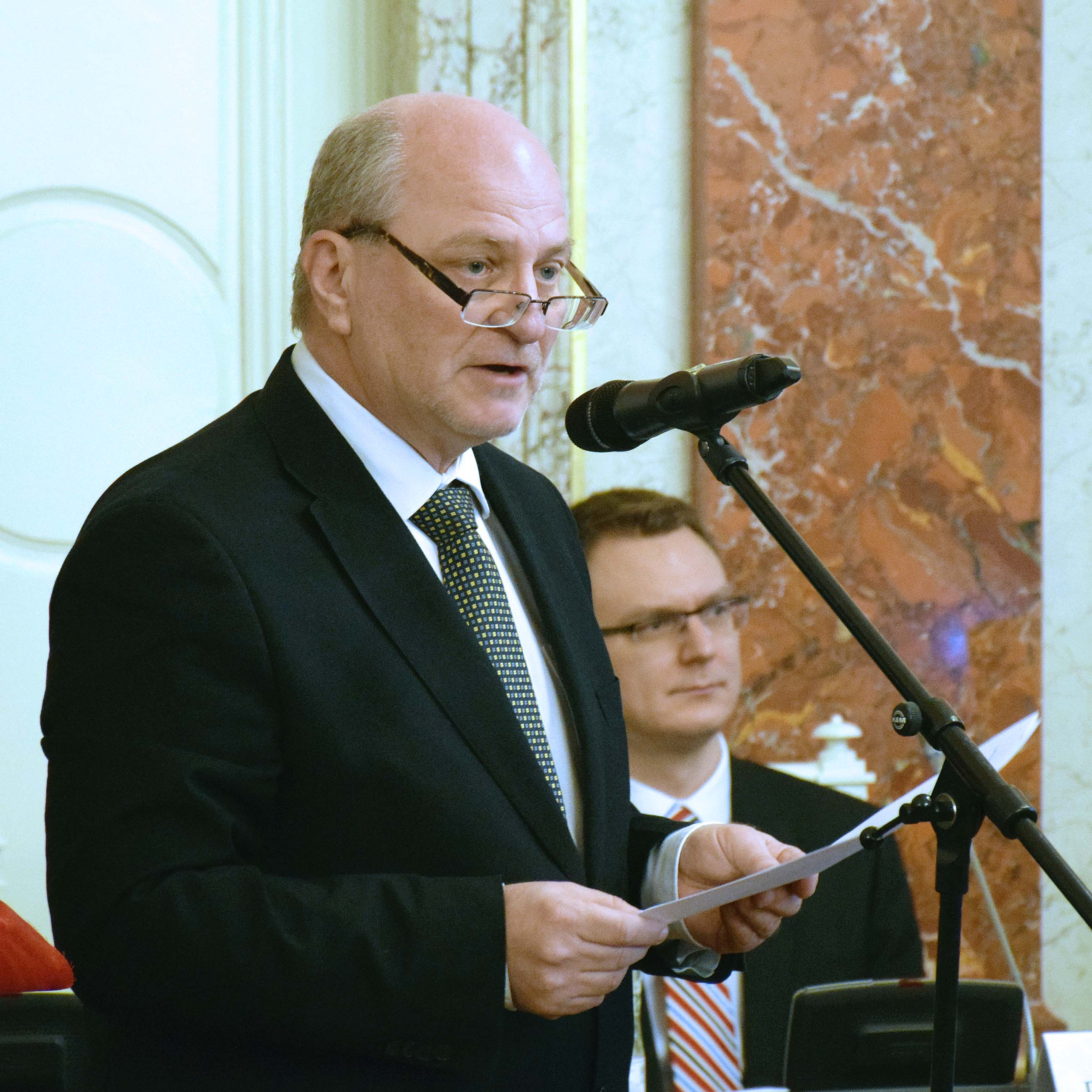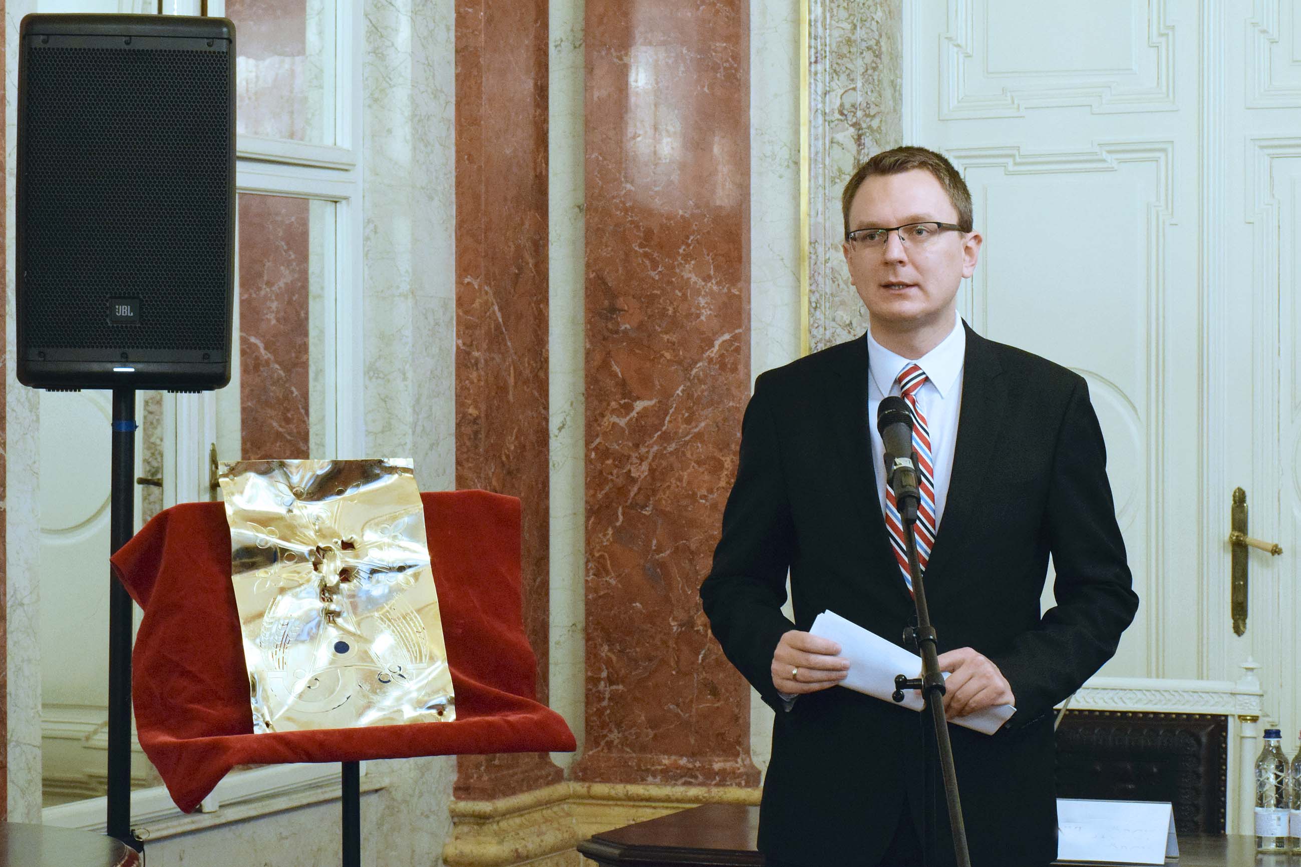 Rétvári Bence, az Emberi Erőforrások Minisztériumának parlamenti államtitkára, a Kereszténydemokrata Néppárt alelnöke megnyitó beszédet mond a hitükért üldözött keresztények segítésének, támogatásának lehetőségeiről tartott, az üldözött keresztények megsegítéséért felelős helyettes államtitkárság rendezvényén a budapesti Központi Papnevelő Intézetben 2017. január 27-én. (KDNP Fotó: Váli Miklós)