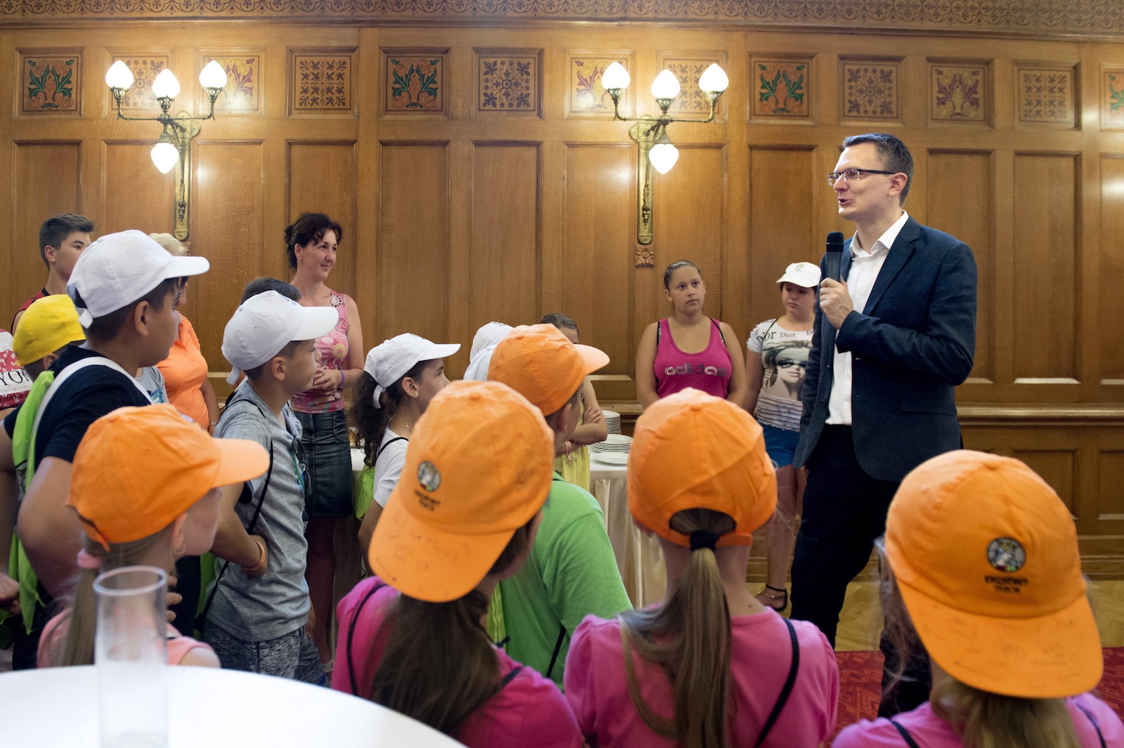 Rétvári Bence, az Emberi Erőforrások Minisztériumának parlamenti államtitkára fogadja az Erzsébet-táborokban táborozó kárpátaljai gyerekeket a Parlamentben 2016. június 24-én. (MTI Fotó: Koszticsák Szilárd)