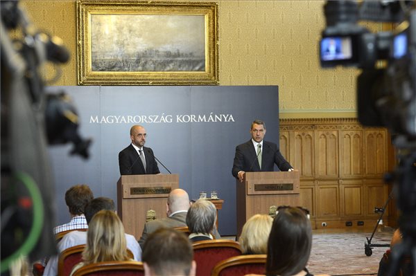 Lázár János, a Miniszterelnökséget vezető miniszter (j) szokásos heti sajtótájékoztatóját tartja az Országházban 2016. szeptember 15-én. Mellette Kovács Zoltán kormányszóvivő. (MTI Fotó: Soós Lajos)