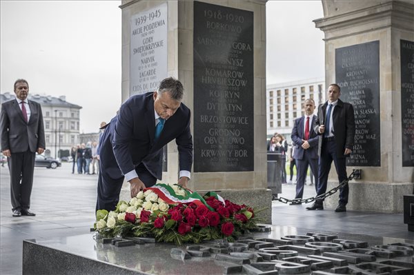 Délelőtt Orbán Viktor koszorúzáson vett részt az ismeretlen katona sírjánál, innen ment a lengyel miniszterelnöki hivatalba, ahol katonai tiszteletadással fogadták.