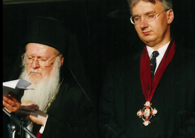 I. Bartholomaiosz konstantinápolyi egyetemes pátriárka és Semjén Zsolt miniszterelnökhelyettes, a KDNP elnöke, Őszentsége első magyarországi látogatásán, 2000-ben.