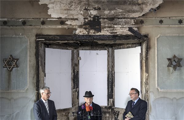 Soltész Miklós, az Emberi Erőforrások Minisztériumának (Emmi) nemzetiségi és civil társadalmi kapcsolatokért felelős államtitkára, a KDNP alelnökeKardos Péter főrabbi és Heisler András, a Magyarországi Zsidó Hitközségek Szövetségének (Mazsihisz) elnöke (b-j) a kormány felújítási támogatását bejelentő sajtótájékoztatón a 2016 októberében leégett zuglói zsinagógában 2017. március 28-án. (MTI Fotó: Szigetváry Zsolt)