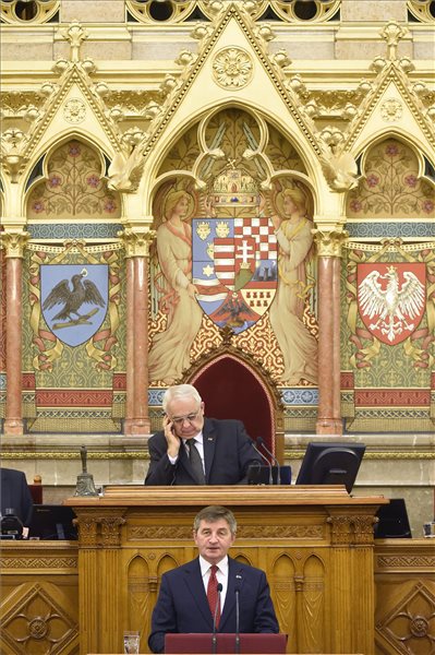 Marek Kuchcinski, a lengyel szejm (alsóház) elnöke beszédet mond az Országgyűlés 1956-2016 - Tele volt halottakkal a tér... címmel megrendezett ünnepi ülésén az Országházban 2016. október 25-én. Mögötte Latorcai János, az Országgyűlés kereszténydemokrata alelnöke. (MTI Fotó: Kovács Tamás)