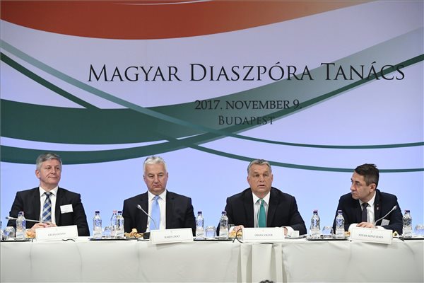 Orbán Viktor miniszterelnök (j2) beszédet mond a világban szétszórtságban élő magyarság szervezeteit tömörítő Magyar Diaszpóra Tanács plenáris ülésén a fővárosi Várkert Bazárban 2017. november 9-én. Mellette Semjén Zsolt nemzetpolitikáért felelős miniszterelnök-helyettes (b2), Potápi Árpád János, a Miniszterelnökség nemzetpolitikáért felelős államtitkára (j) és Grezsa István Szabolcs-Szatmár-Bereg megye és Kárpátalja együttműködésének és összehangolt fejlesztési feladatainak koordinációjáért felelős kormánybiztos (b). (MTI Fotó: Koszticsák Szilárd)
