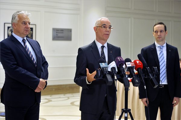 Semjén Zsolt nemzetpolitikáért felelős miniszterelnök-helyettes (b), Balog Zoltán, az emberi erőforrások minisztere (k) és Azbej Tristan, az üldözött keresztények megsegítéséért felelős helyettes államtitkár (j) sajtótájékoztatót tart a Válaszok keresése egy hosszú ideje elhallgatott válságra címmel rendezett kétnapos nemzetközi konferencia zárónapján Budapesten 2017. október 13-án. (MTI Fotó: Kovács Attila)