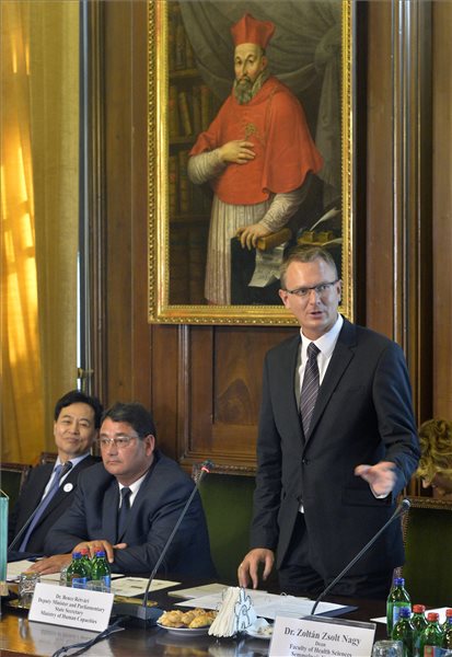 Rétvári Bence, az Emberi Erőforrások Minisztériumának parlamenti államtitkára Merkely Béla, a Semmelweis Egyetem klinikai rektorhelyettese, a Kína és a közép-kelet-európai kórházak közötti együttműködési szövetség magyar társelnöke (j2) és Csao Ju-pej, a Kína és a közép-kelet-európai kórházak közötti együttműködési szövetség társelnöke a Semmelweis Egyetemen tartott sajtótájékoztatón 2016. augusztus 23-án. A Kína és a közép-kelet-európai kórházak közötti együttműködési szövetséghez újabb négy magyarországi kórház, a Bács-Kiskun Megyei Kórház, a Borsod-Abaúj-Zemplén Megyei Kórház és Egyetemi Oktatókórház, a Szabolcs-Szatmár-Bereg Megyei Kórházak és Oktatókórház, valamint a budapesti Uzsoki utcai Kórház és Rendelőintézet csatlakozott. (MTI Fotó: Máthé Zoltán)