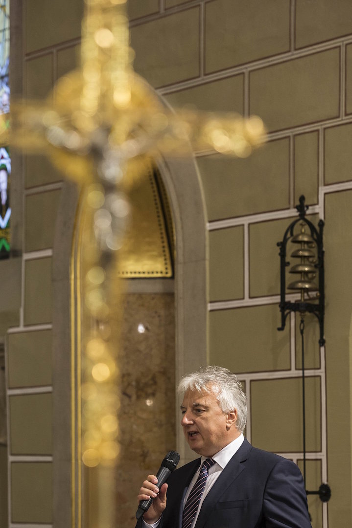 Semjén Zsolt nemzetpolitikáért felelős miniszterelnök-helyettes, a KDNP elnöke Márfi Gyula aranymiséjén a veszprémi érsek pappá szentelésének 50. évfordulóján a veszprémi Szent Mihály-bazilikában 2017. június 19-én. (MTI Fotó: Bodnár Boglárka)