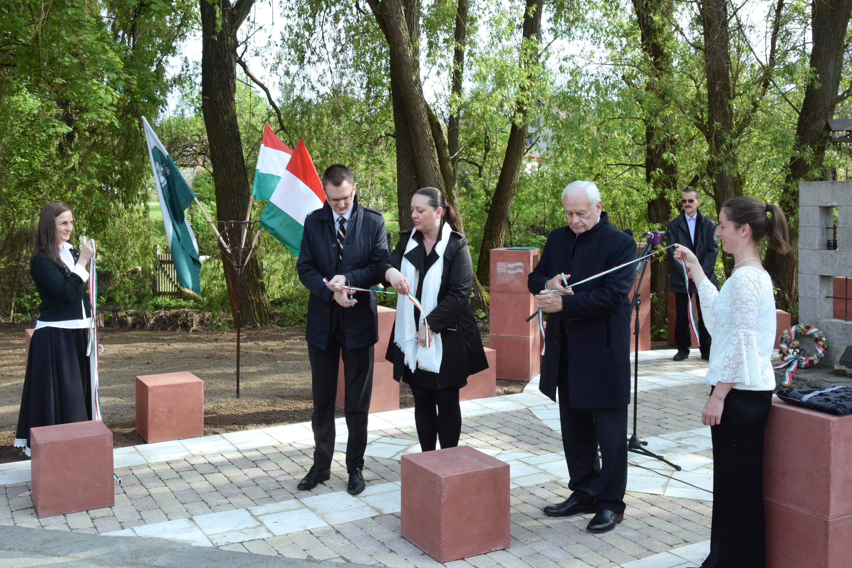 Harrach Péter, a KDNP frakcióvezetője (j) és Rétvári Bence, az Emberi Erőforrások Minisztériumának parlamenti államtitkára, a KDNP alelnöke (b) átvágja a felújított '56-os emlékmű szalagját Szokolyán. (KDNP Fotó: Váli Miklós)