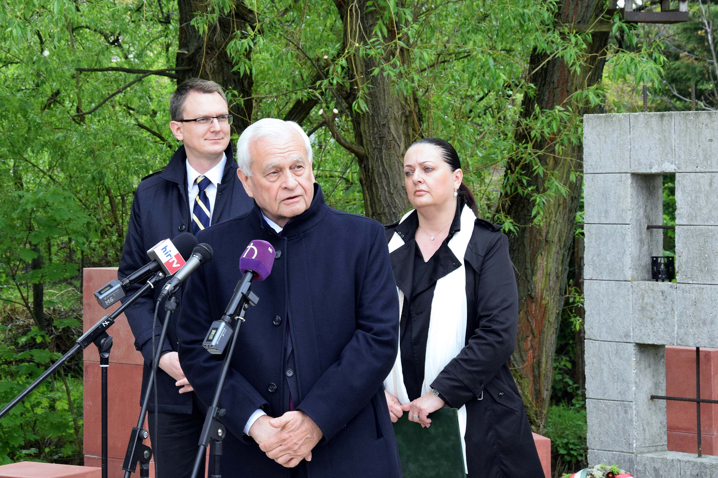 Harrach Péter, a Kereszténydemokrata Néppárt frakcióvezetője mond ünnepi beszédet, mögötte Némethné Pintér Csilla, Szokolya polgármestere és Rétvári Bence, az EMMI államtitkára, a KDNP alelnöke (KDNP Fotó: Váli Miklós)