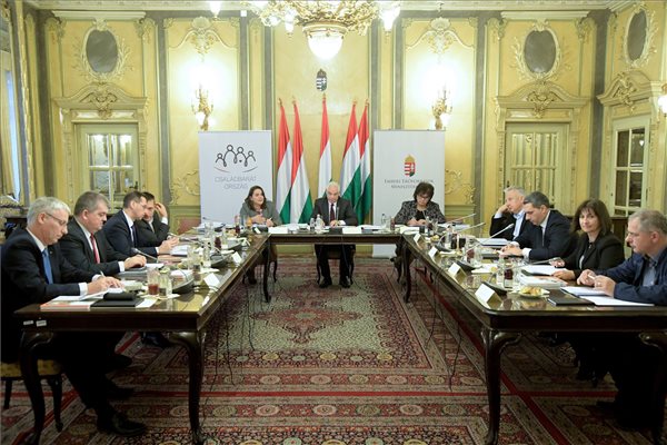 Novák Katalin, az Emberi Erőforrások Minisztériumának (Emmi) család- és ifjúságügyért felelős államtitkára (szemben b) beszél, mellette Balog Zoltán, az emberi erőforrások minisztere (szemben k) és Lengyel Györgyi, az Emmi közigazgatási államtitkára (j) a családügyi kabinet ülésén az Emberi Erőforrások Minisztériumában 2017. november 8-án. Ezen a napon megalakult a családügyi kabinet, az első ülésen szó esett a Kopp Mária szociológus nevét viselő népesedéspolitikai intézet felállításáról, valamint különböző családtámogatási intézkedésekről is. Balról Soltész Miklós, az Emmi egyházi, nemzetiségi és civil társadalmi kapcsolatokért felelős kereszténydemokrata államtitkára (b), Czibere Károly, az Emmi szociális ügyekért és társadalmi felzárkózásért felelős államtitkára (b2), Varga Mihály nemzetgazdasági miniszter (b3) és Rogán Antal, a Miniszterelnöki Kabinetirodát vezető miniszter (b4). Jobbról Semjén Zsolt nemzetpolitikáért felelős miniszterelnök-helyettes, a KDNP elnöke (j4), Lázár János, a Miniszterelnökséget vezető miniszter (j3), Vízkelety Mariann, az Igazságügyi Minisztérium igazságügyi kapcsolatokért felelős államtitkára (j2) és Kósa Lajos, a megyei jogú városok fejlesztéséért felelős tárca nélküli miniszter (j). (MTI Fotó: Emmi / Bartos Gyula)