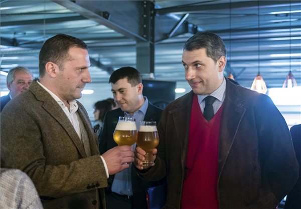 Lénárd András, a Csíki Sör Manufaktúrát üzemeltető Lixid Project Kft. vezetője és Lázár János Miniszterelnökséget vezető miniszter sörrel koccint az Igazi Csíki Sört gyártó csíkszentsimoni sörfőzdében 2017. március 24-én. (MTI Fotó: Veres Nándor)