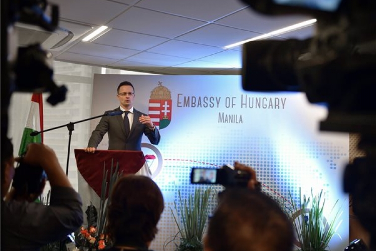 Szijjártó Péter külgazdasági és külügyminiszter beszédet mond Magyarország manilai nagykövetségének megnyitóján 2017. március 28-án. (MTI Fotó: KKM)
