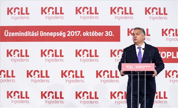 Orbán Viktor miniszterelnök beszédet mond a Kall Ingredients Kft. tiszapüspöki izocukorüzemének avatásán 2017. október 30-án. A magyar tulajdonban lévő vállalat 2015-ben jött létre azzal a céllal, hogy GMO-mentes magyar kukoricából cukor- és keményítőféleségeket állítson elő és értékesítsen. MTI Fotó: Szigetváry Zsolt