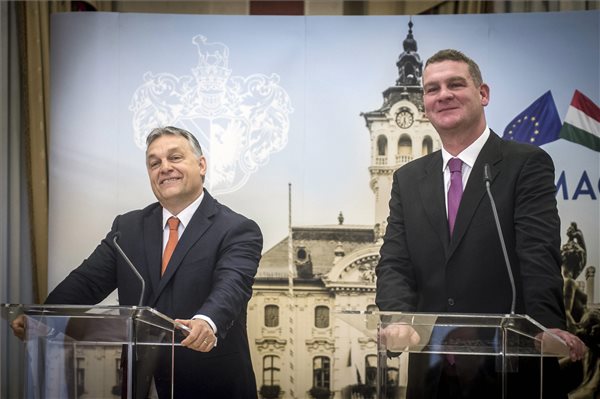 Orbán Viktor miniszterelnök (b) és Botka László (MSZP) polgármester a Modern városok program keretében kötött együttműködési megállapodás aláírása után tartott sajtótájékoztatón a szegedi városházán 2017. január 30-án. (MTI Fotó: Ujvári Sándor)