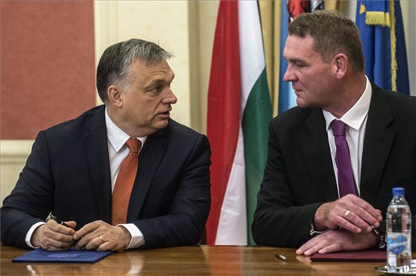 Orbán Viktor miniszterelnök és Botka László (MSZP) polgármester a Modern városok program keretében kötött együttműködési megállapodás aláírásán a szegedi városházán 2017. január 30-án. (MTI Fotó: Ujvári Sándor)