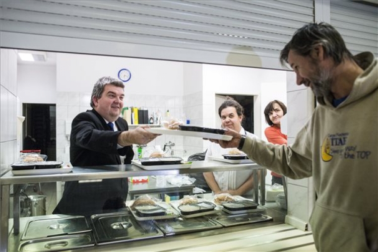 Czibere Károly szociális ügyekért és társadalmi felzárkózásért felelős államtitkár (b) a Hajléktalanokért Közalapítvány Szobi utcai nappali melegedőjében tartott ételosztáson 2016. december 22-én. Négy éven át négyezer hajléktalan ember kaphat meleg ételt hétköznaponként, összesen négymilliárd forintból a fedél nélkülieket segítő és ellátó intézményeken keresztül egy most induló, uniós és hazai forrású programnak köszönhetően. (MTI Fotó: Marjai János)