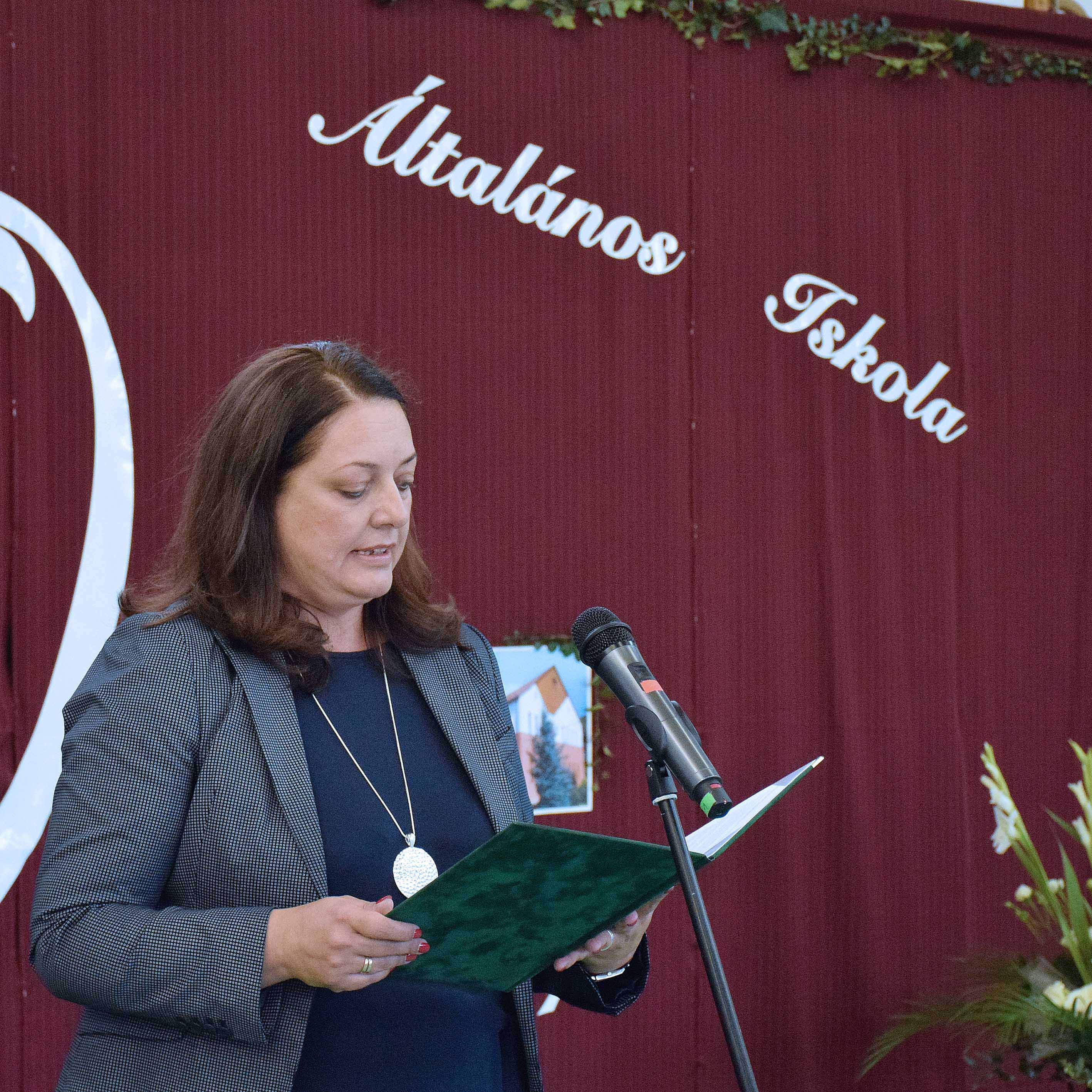 Némethné Pintér Csilla, a Pest megyei Szokolya független polgármestere mond beszédet, a fennállásának 40. évfordulójára felújított Cseh Péter Általános Iskola és tornatermi épületblokk átadási ünnepségén (Fotó: Váli Miklós)