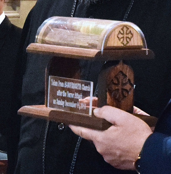 A pesti ferences templomnak adományozott ereklye, amely a húsvéti kairói robbantás áldozatainak vérét hordozza magán (KDNP Fotó: Váli Miklós)