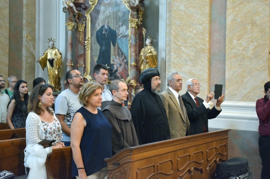 Anba Ermia kopt keresztény püspök, a kairói Kopt Ortodox Kulturális Központ igazgatója (az első sorban, középen); tőle balra Semjénné Menus Gabriella kórusvezető; mellette balra Kveck Péter, Magyarország kairói nagykövete feleségével. A kopt püspöktől jobbra Fr. Várnai Jakab OFM tartományfőnök-helyettes (KDNP Fotó: Váli Miklós)
