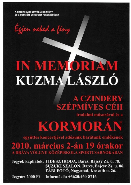 2010. március 2-án a barcsi Dráva Völgye Középiskolában emlékezünk a közelmúltban elhunyt kereszténydemokrata képviselőre, Kuzma Lászlóra. Az est során fellép a Kormorán zenekar, valamint megtekinthetjük a Czindery Szépmíves Céh irodalmi műsorát.