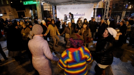 Résztvevők táncolnak a nyolcnapos zsidó vallási ünnep, a hanuka harmadik estéjén, a lámpás meggyújtása után a budapesti Nyugati téren 2016. december 26-án. (MTI Fotó: Demecs Zsolt)