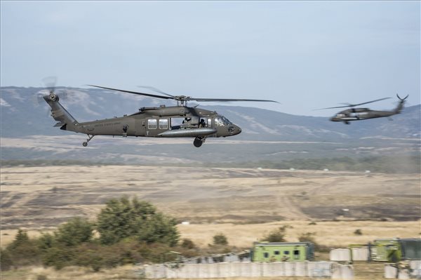 Katonai helikopterek a Black Swan 2016 elnevezésű hadgyakorlaton Veszprém közelében, a gyulafirátóti lőtéren 2016. szeptember 29-én. (MTI Fotó: Bodnár Boglárka)