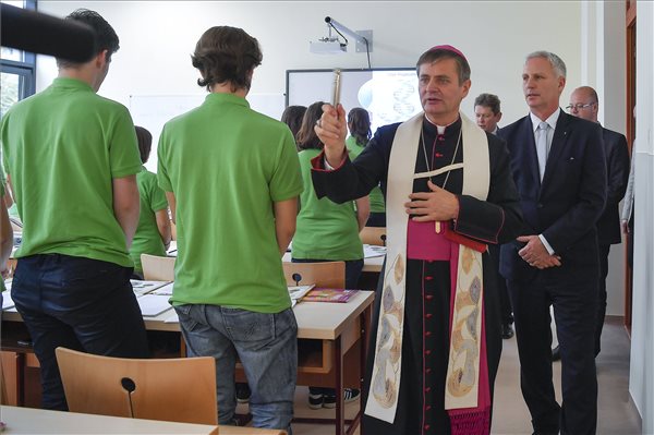 Schönberger Jenő szatmári római katolikus püspök megáldja a Hám János Római Katolikus Teológiai Líceum egyik új szaktantermét a partiumi Szatmárnémetiben 2017. október 27-én. Mögötte Soltész Miklós, az Emberi Erőforrások Minisztériumának egyházi, nemzetiségi és civil társadalmi kapcsolatokért felelős államtitkára A magyar kormány támogatásával három új szaktanteremmel bővült az intézmény. (MTI Fotó: Czeglédi Zsolt)
