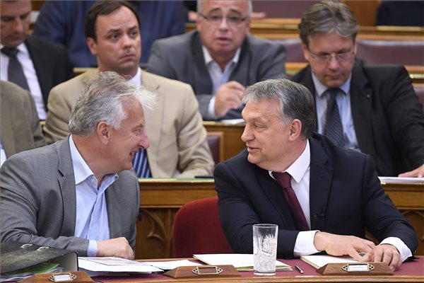 Orbán Viktor miniszterelnök azonnali kérdésre válaszol az Országgyűlés plenáris ülésén 2017. június 6-án. Mellette Semjén Zsolt nemzetpolitikáért felelős miniszterelnök-helyettes, balra Németh Szilárd, a Fidesz frakcióvezető-helyettese (MTI Fotó: Kovács Tamás)