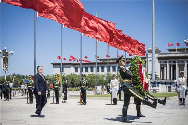 A hivatalos látogatáson Kínában tartózkodó Orbán Viktor miniszterelnök koszorúz a pekingi Tienanmen téren 2017. május 13-án. (MTI Fotó: Miniszterelnöki Sajtóiroda / Szecsődi Balázs)