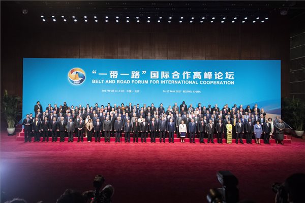 Családi fotó készül az Egy övezet, egy út elnevezésű nemzetközi együttműködési fórum résztvevőiről a pekingi Kína Nemzeti Kongresszusi Központban 2017. május 14-én. Az első sorban Orbán Viktor miniszterelnök (b4). (MTI Fotó: Miniszterelnöki Sajtóiroda / Szecsődi Balázs)
