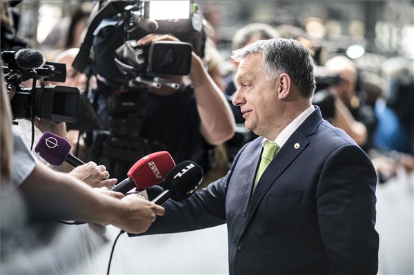Az Európai Unió állam- és kormányfőinek kétnapos csúcstalálkozójára érkező Orbán Viktor miniszterelnök újságíróknak nyilatkozik Brüsszelben 2017. június 22-én. (MTI Fotó: Miniszterelnöki Sajtóiroda / Szecsődi Balázs)