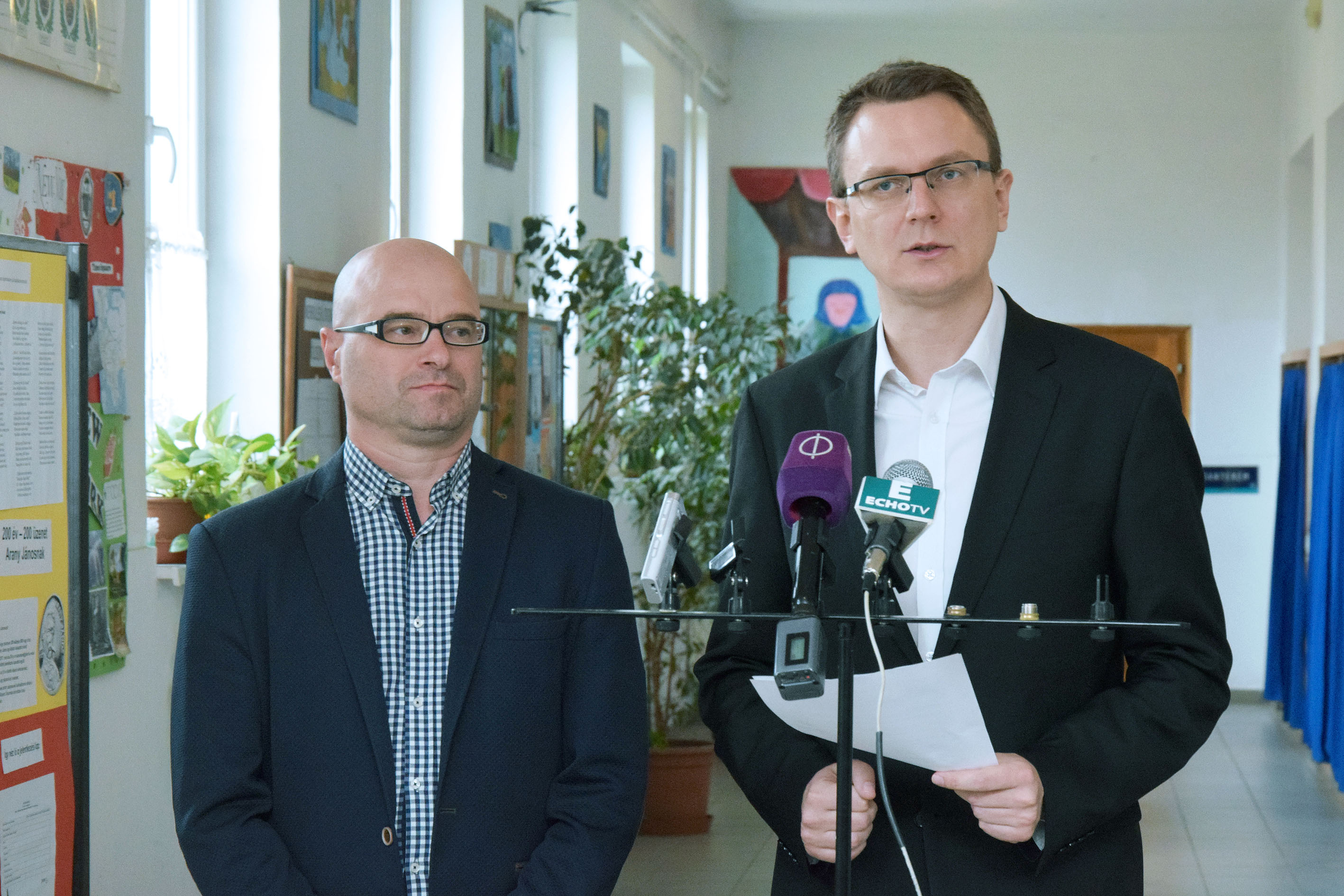 Spiegelhalter László, Vácrátót polgármestere és Rétvári Bence, az Emberi Erőforrások Minisztériumának parlamenti államtitkára, a Kereszténydemokrata Néppárt alelnöke a Vácrátóti Petőfi Sándor Általános Iskolában (KDNP Fotó: Váli Miklós)