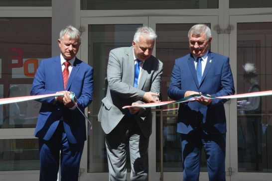 Törő Gábor országgyűlési képviselő (Fidesz), Semjén Zsolt miniszterelnök-helyettes és Fenyves Péter móri polgármester (Fidesz-KDNP) a nemzeti színű szalag átvágásával felavatta az új iskolaépületet (KDNP Fotó: Váli Miklós)