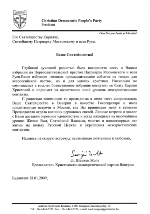 Örömmel emlékszem vissza arra az időre, amikor abban a megtiszteltetésben részesülhettem, hogy Szentségedet Államtitkári minőségben fogadhattam Magyarországon és gyümölcsöző találkozásunkra Moszkvában, ahol Ön engem a Külső Egyházi Kapcsolatok Osztálya vezetőjeként fogadott. A személyes találkozók és az Önnel folytatott, mindig nagyon magas szellemi szinten folytatott dialógus nagy megelégedettségemre szolgáltak. Kívánok Önnek, Szentséges Atya, az Orosz Egyház érdekében és a keresztény-közi kapcsolatok megerősítéséért folytatott hosszú és gyümölcsöző éveket.