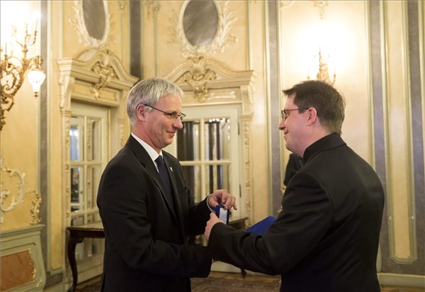 A Fraknói Vilmos-díj idei két kitüntetettje, Szovák Kornél, a Pázmány Péter Katolikus Egyetem Bölcsészettudományi Karának oktatója és Gárdonyi Máté, a Veszprémi Érseki Hittudományi Főiskola tanára az Emberi Erőforrások Minisztériumának (Emmi) egyházi, nemzetiségi és civil társadalmi kapcsolatokért felelős államtitkára, Soltész Miklós társaságában az elismerés átadásán az Emmi Tükörtermében 2015. november 30-án. (MTI/Fotó: Mohai Balázs)