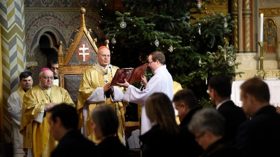 Erdő Péter bíboros, esztergom-budapesti érsek (középen) a IV. Károly királlyá koronázásnak centenáriuma alkalmából rendezett ünnepi szentmisén a Budavári Nagyboldogasszony-, közismert nevén Mátyás-templomban 2016. december 30-án. (MTI Fotó: Kovács Tamás)
