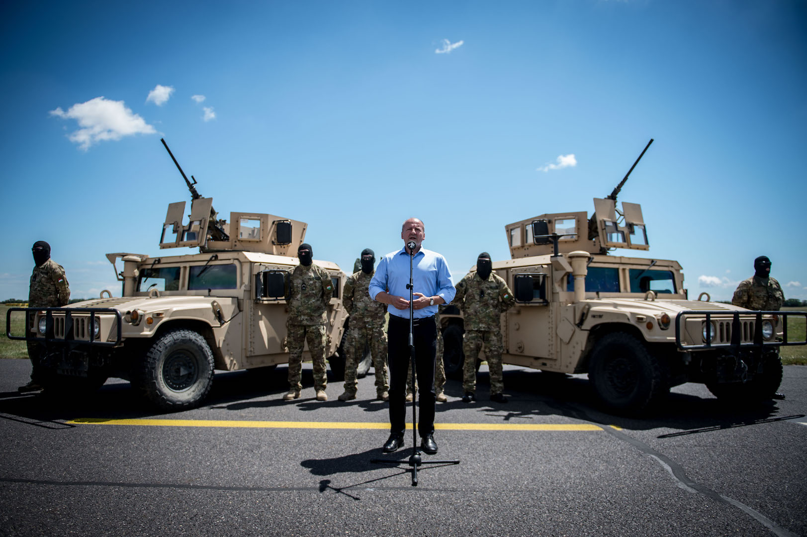 Áder János köztársasági elnök (j3) katonák fegyverzetét nézi a Saber Guardian 2017 nemzetközi hadgyakorlat-sorozat Black Swan 2017 elnevezésű különleges műveleti gyakorlatának sajtónyilvános napján Szolnokon 2017. július 12-én. Mellette Simicskó István honvédelmi miniszter (b3) és Szalay Ferenc polgármester (b). (MTI Fotó: Koszticsák Szilárd)