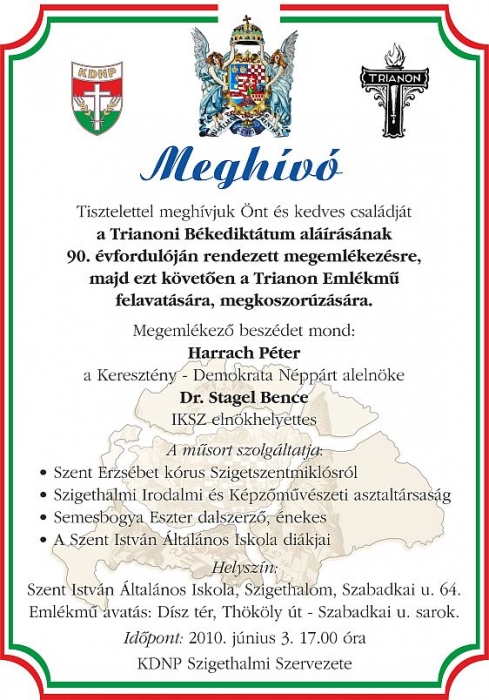2010. június 3-án, 17 órától megemlékezést tart Trianonról a KDNP Szigethalmi és Pest megyei szervezete. Emlékező beszédet mond Harrach Péter, a KDNP alelnöke és leendő frakcióvezetője, valamint Stágel Bence, az IKSZ alelnöke.