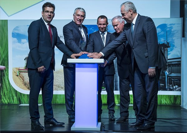 Seszták Miklós nemzeti fejlesztési miniszter (b), Bige László, a Nitrogénművek Zrt. elnök-vezérigazgatója (b2), Bige Zoltán, a Nitrogénművek Zrt. tulajdonosa (k), Szilágyi János, a Nitrogénművek Zrt. vezérigazgatója (j2) és Kontrát Károly, a Belügyminisztérium parlamenti államtitkára (j) a Nitrogénművek Zrt. 140 milliárd forint értékű beruházásáról tartott tájékoztatón Pétfürdőn 2016. szeptember 22-én. (MTI Fotó: Bodnár Boglárka)