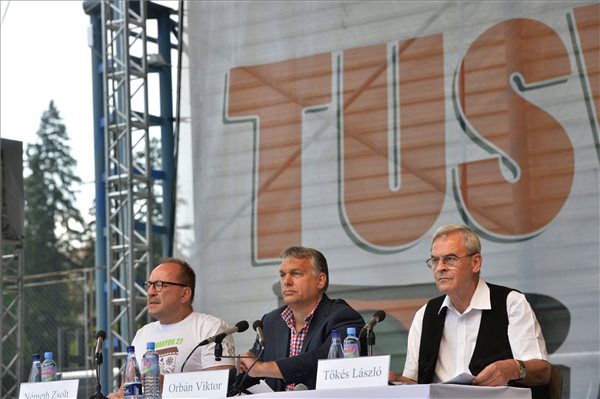 Orbán Viktor miniszterelnök, Németh Zsolt, az Országgyűlés külügyi bizottságának fideszes elnöke (b) és Tőkés László európai parlamenti képviselő, az Erdélyi Magyar Nemzeti Tanács (EMNT) elnöke a 27. Bálványosi Nyári Szabadegyetem és Diáktáborban (Tusványos) az erdélyi Tusnádfürdőn 2016. július 23-án. (MTI Fotó: Máthé Zoltán)