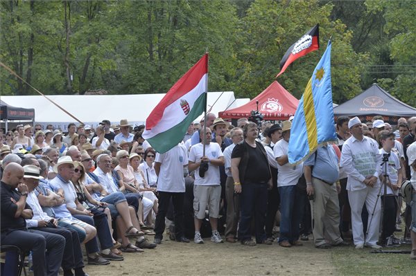 Orbán Viktor miniszterelnök (b2), Németh Zsolt, az Országgyűlés külügyi bizottságának fideszes elnöke (b3) és Tőkés László európai parlamenti képviselő, az Erdélyi Magyar Nemzeti Tanács (EMNT) elnöke (b) a 27. Bálványosi Nyári Szabadegyetem és Diáktáborban (Tusványos) az erdélyi Tusnádfürdőn 2016. július 23-án. (MTI Fotó: Miniszterelnöki Sajtóiroda / Szecsődi Balázs)