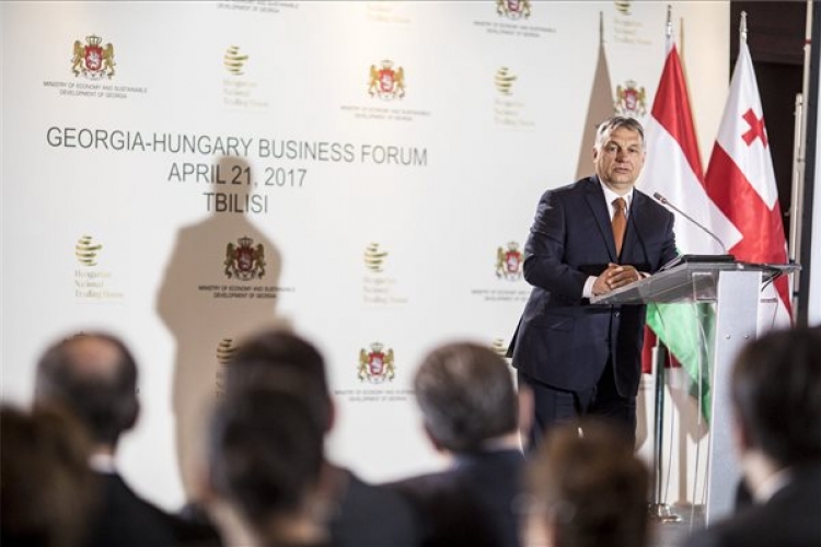 A Miniszterelnöki Sajtóiroda által közzétett képen Orbán Viktor kormányfő beszédet mond a grúz-magyar üzleti fórum megnyitóján Tbilisziben 2017. április 21-én. (Fotó: Miniszterelnöki Sajtóiroda / Szecsődi Balázs – MTI)