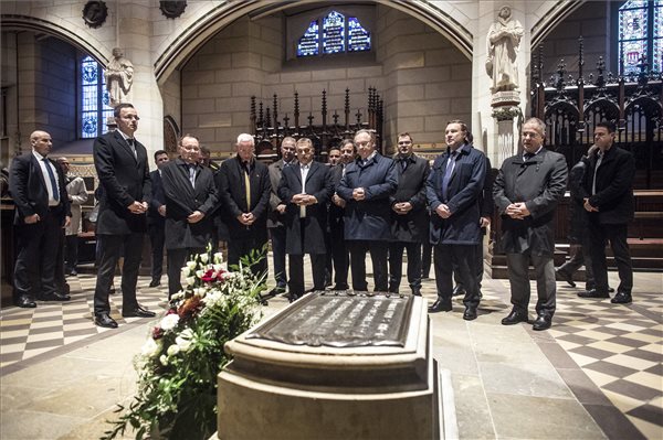 A Miniszterelnöki Sajtóiroda által közreadott képen Orbán Viktor miniszterelnök (k, balra) és Reiner Haseloff, Szász-Anhalt tartomány miniszterelnöke (k, jobbra), valamint a magyar kormányzati delegáció Luther Márton sírjánál a wittenbergi vártemplomban 2017. november 6-án. MTI Fotó: Miniszterelnöki Sajtóiroda / Szecsődi Balázs