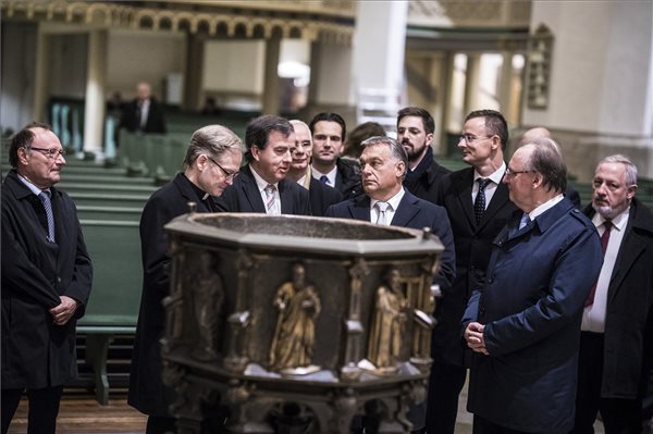 A Miniszterelnöki Sajtóiroda által közreadott képen Orbán Viktor miniszterelnök (elöl, k) és Reiner Haseloff, Szász-Anhalt tartomány miniszterelnöke (elöl, j), valamint a magyar kormányzati delegáció Luther Márton tevékenységéről tartott előadást hallgat a wittenbergi városi templomban 2017. november 6-án. MTI Fotó: Miniszterelnöki Sajtóiroda / Szecsődi Balázs