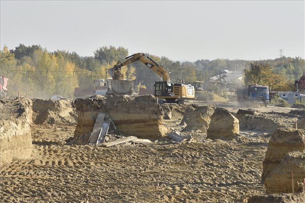 Munkagépek dolgoznak az új komáromi Duna-hídhoz kapcsolódó, a várost elkerülő út építésén Komáromban 2017. október 17-én. Ezen a napon tartották az új híd alapkőletételi ünnepségét a magyar és a szlovák miniszterelnök részvételével Komáromban, a Monostori Erődben, a Dunai-bástyánál. (MTI Fotó: Máthé Zoltán)