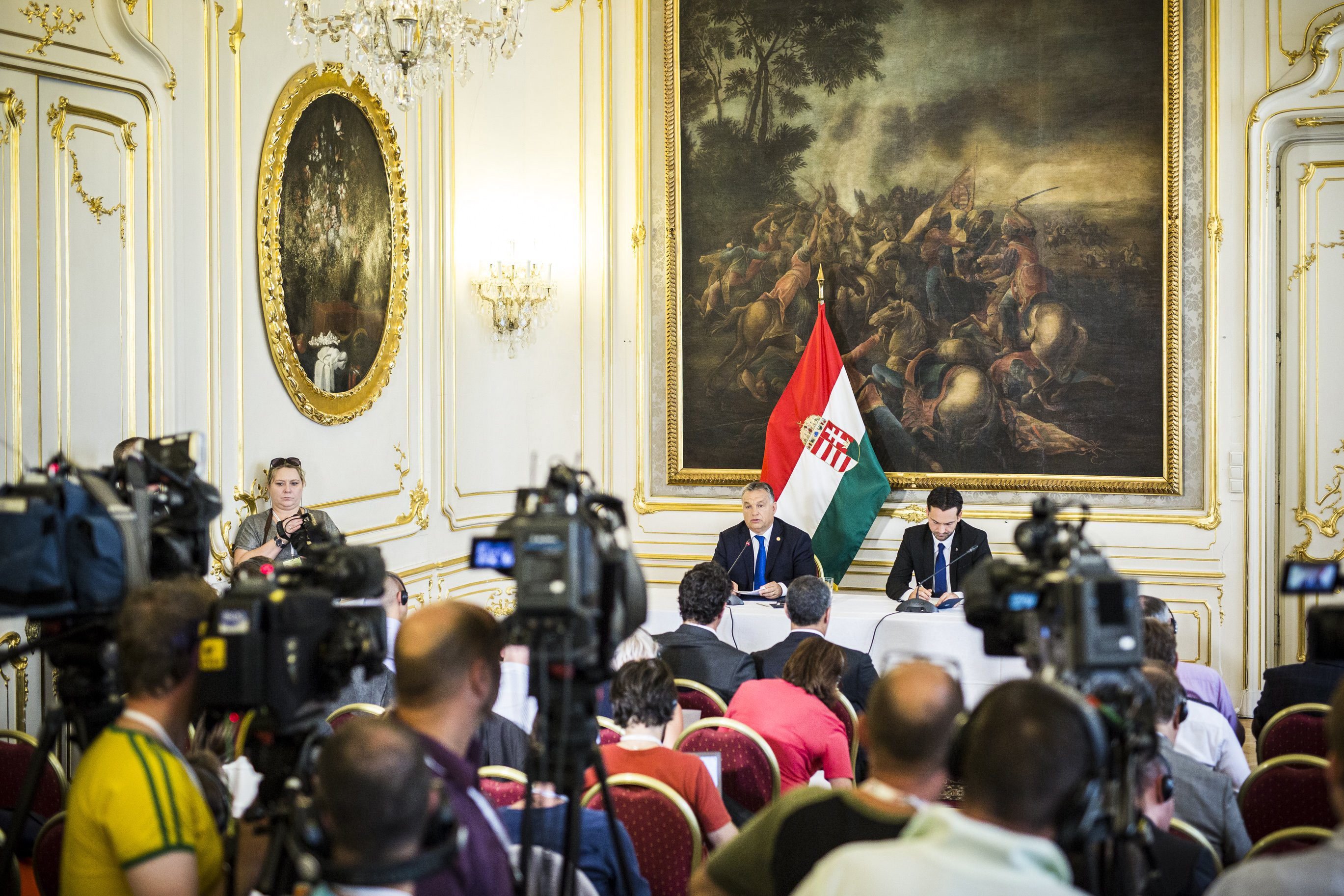 Orbán Viktor miniszterelnök sajtótájékoztatót tart a bécsi migrációs csúcstalálkozót követően 2016. szeptember 24-én. Mellette jobbra Havasi Bertalan, a Miniszterelnöki Sajtóiroda vezetője. Christian Kern osztrák kancellár meghívására tíz ország vezetői tárgyalnak Bécsben a szükséges menekültügyi intézkedésekről. (MTI Fotó: Miniszterelnöki Sajtóiroda / Szecsődi Balázs)
